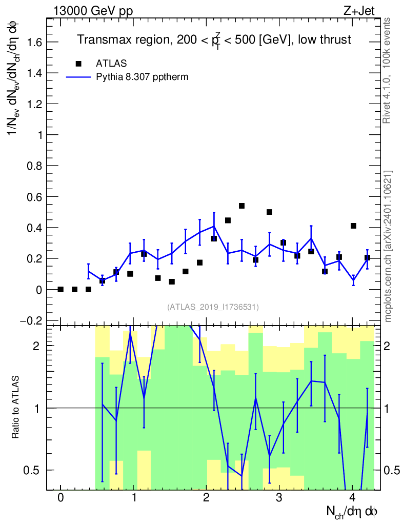 Lines: data, pythia8 8.307 pptherm |