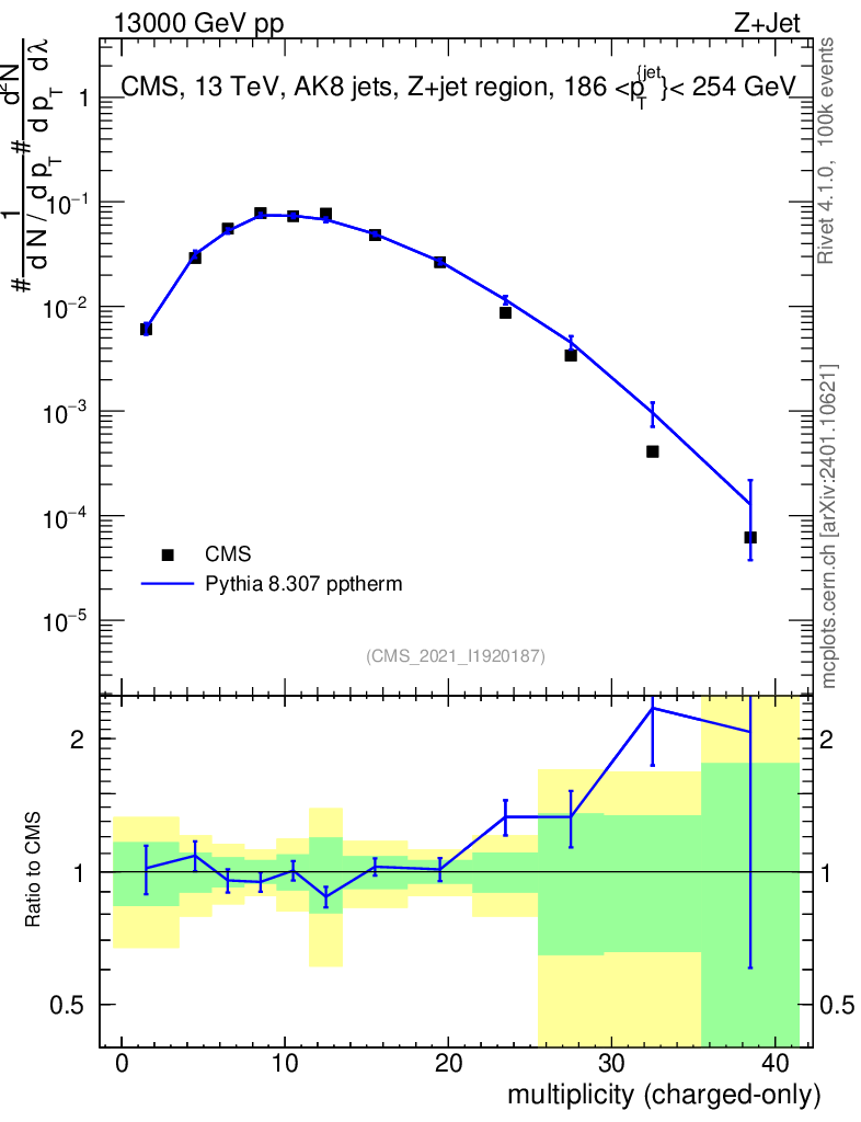 Lines: data, pythia8 8.307 pptherm |