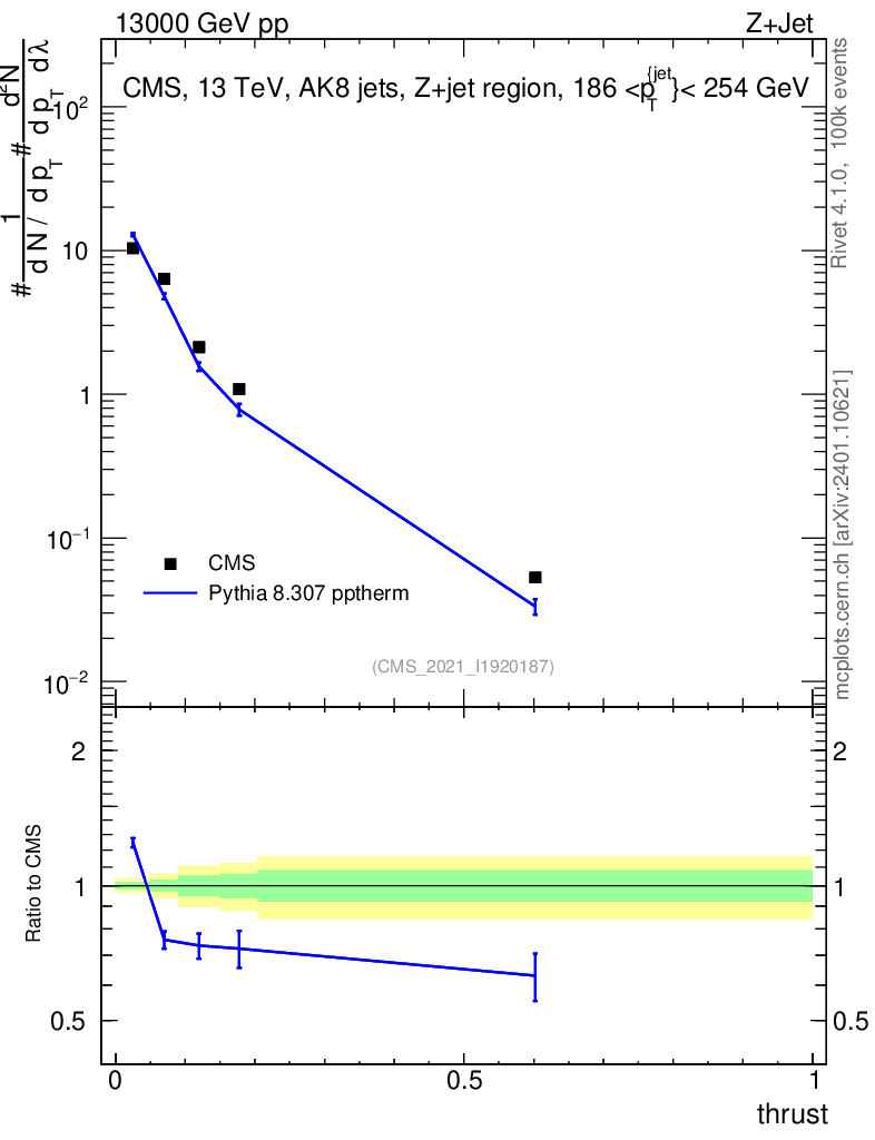 Lines: data, pythia8 8.307 pptherm |
