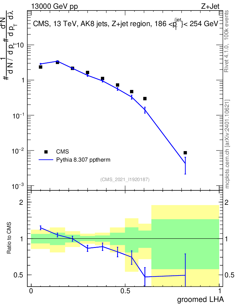 Lines: data, pythia8 8.307 pptherm |