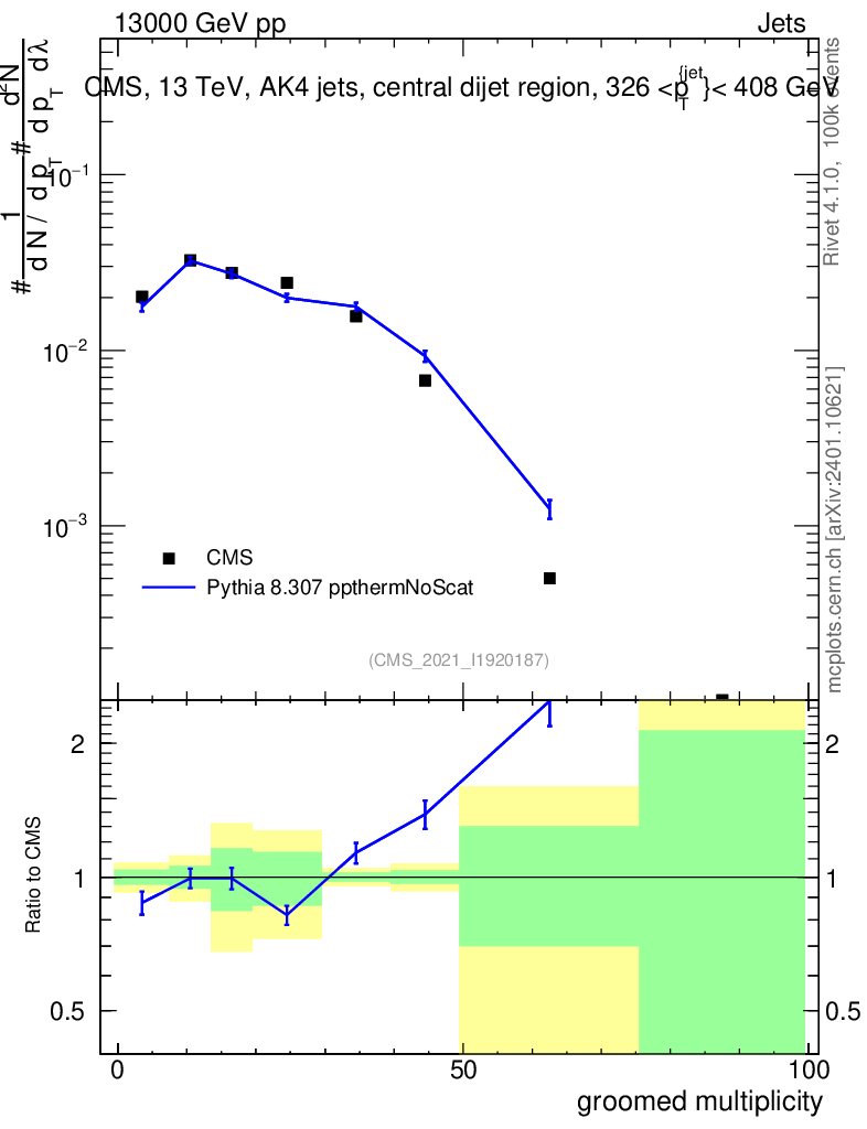 Lines: data, pythia8 8.307 ppthermNoScat |