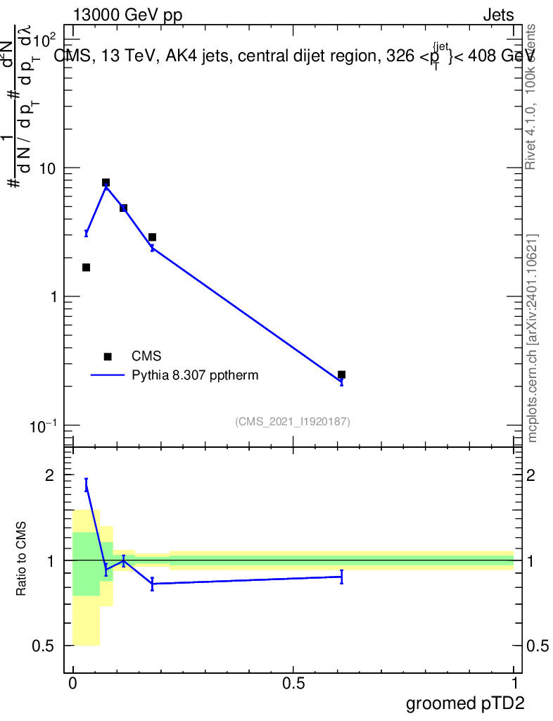 Lines: data, pythia8 8.307 pptherm |