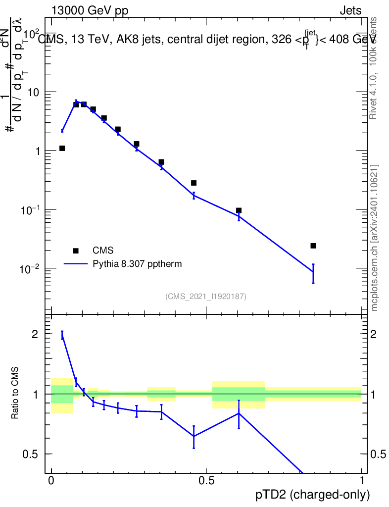 Lines: data, pythia8 8.307 pptherm |