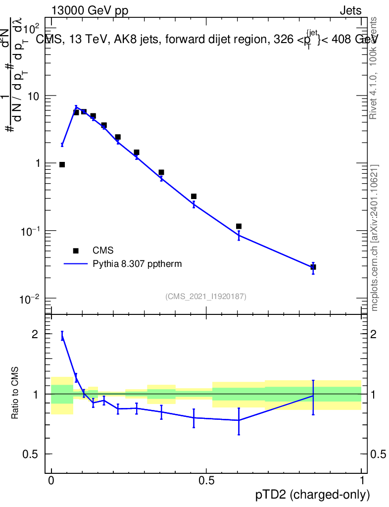 Lines: data, pythia8 8.307 pptherm |