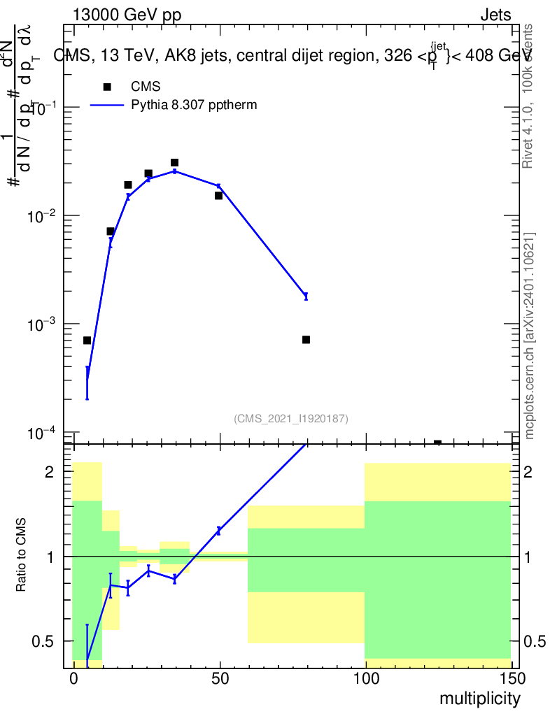 Lines: data, pythia8 8.307 pptherm |