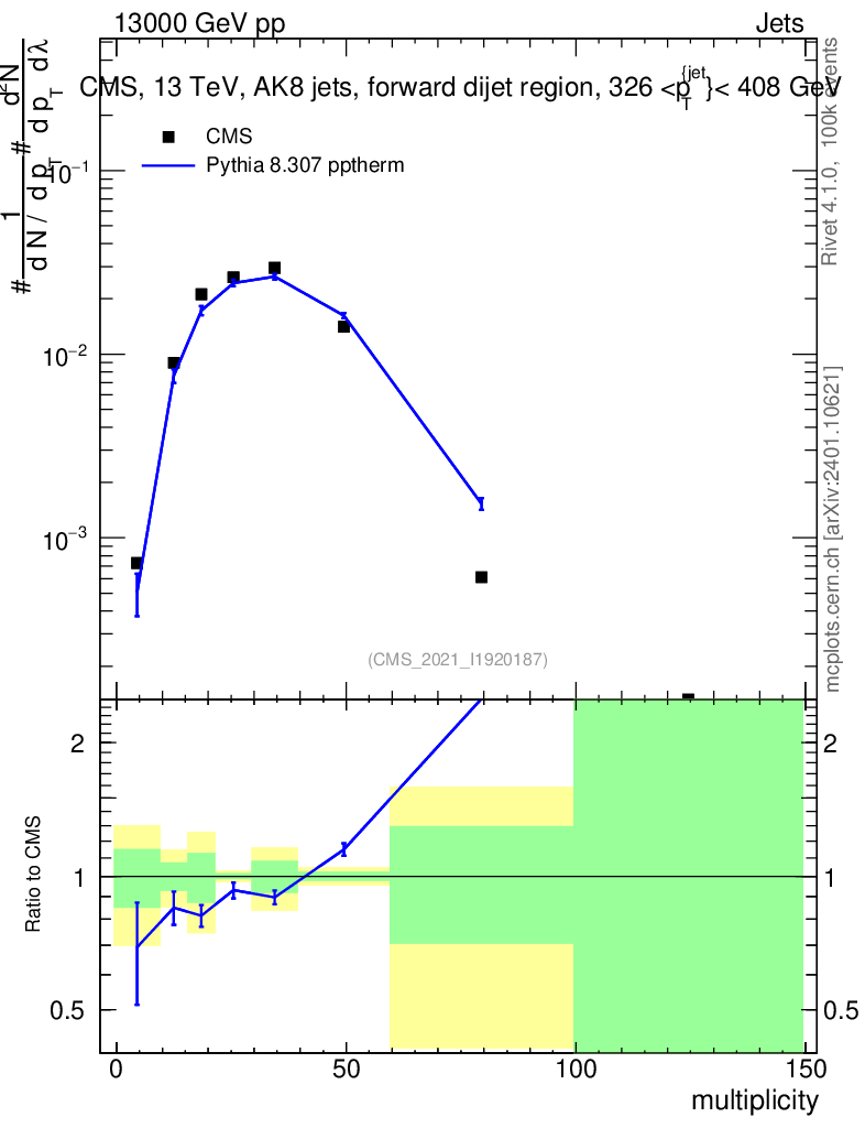 Lines: data, pythia8 8.307 pptherm |