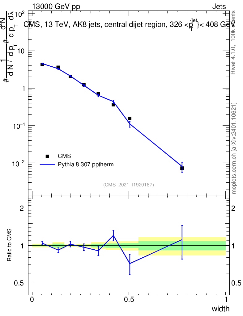 Lines: data, pythia8 8.307 pptherm |