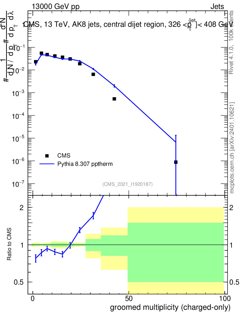Lines: data, pythia8 8.307 pptherm |