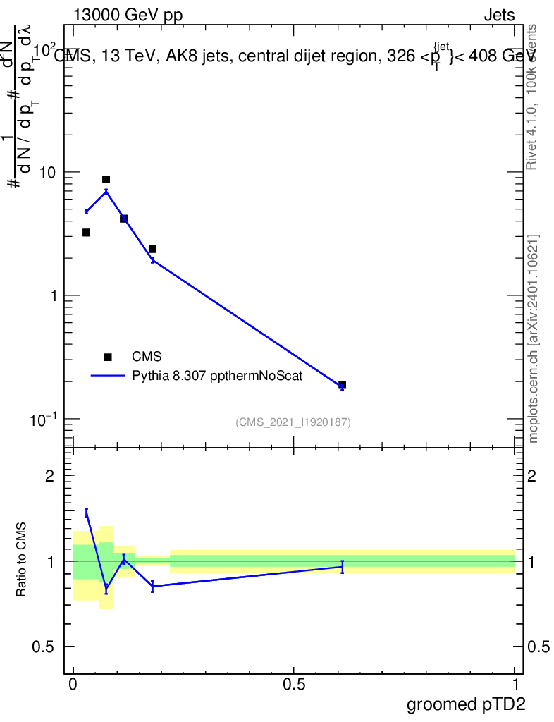 Lines: data, pythia8 8.307 ppthermNoScat |