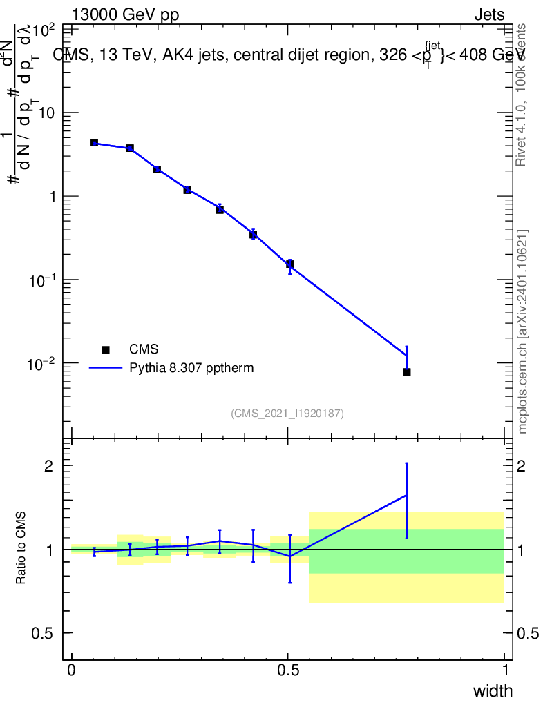 Lines: data, pythia8 8.307 pptherm |
