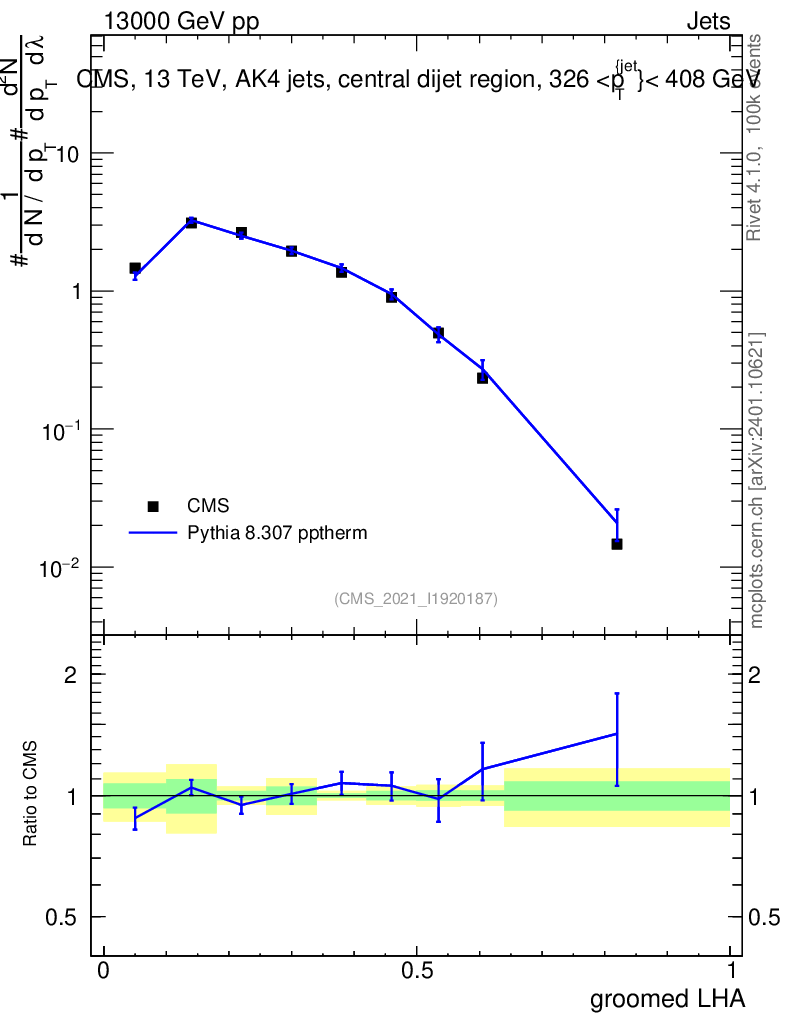 Lines: data, pythia8 8.307 pptherm |