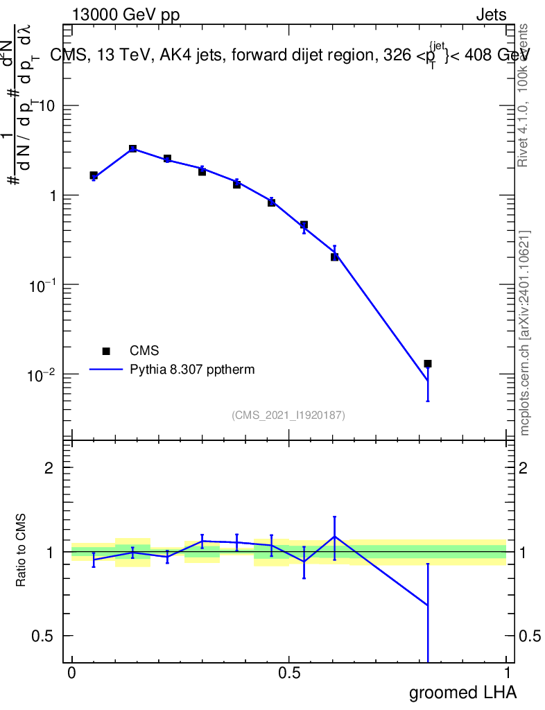 Lines: data, pythia8 8.307 pptherm |