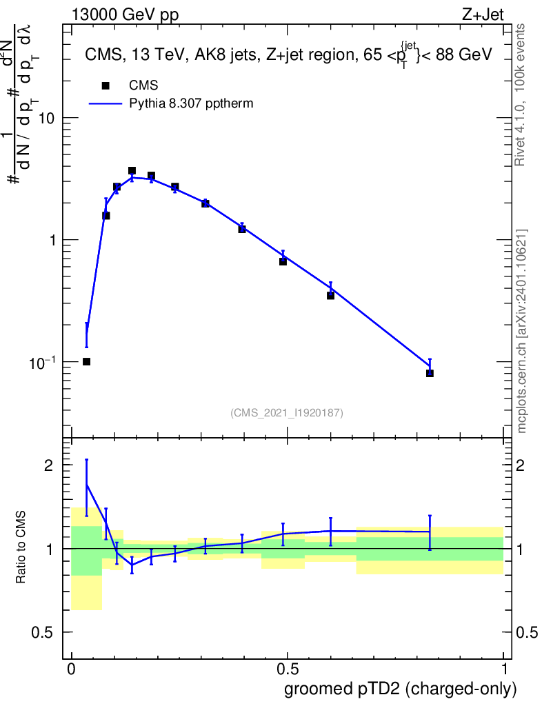 Lines: data, pythia8 8.307 pptherm |
