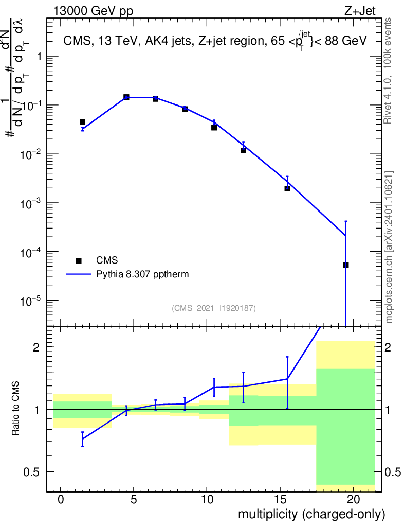 Lines: data, pythia8 8.307 pptherm |
