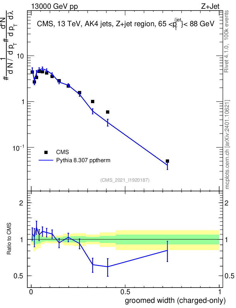 Lines: data, pythia8 8.307 pptherm |