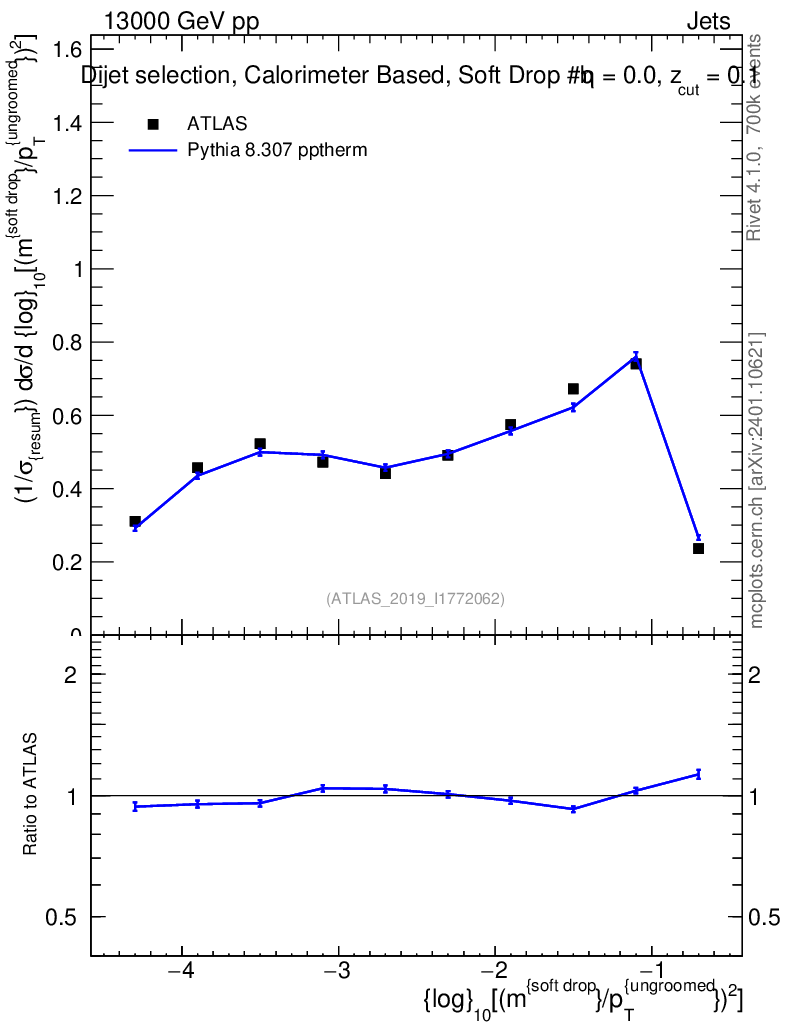Lines: data, pythia8 8.307 pptherm |