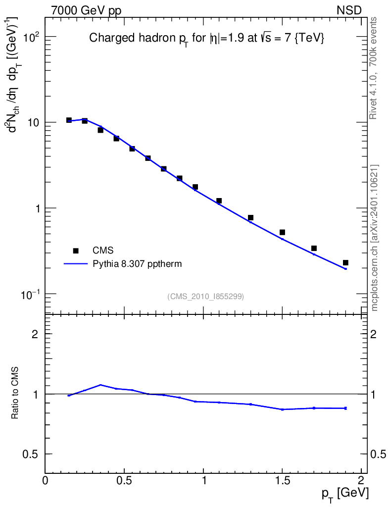 Lines: data, pythia8 8.307 pptherm |