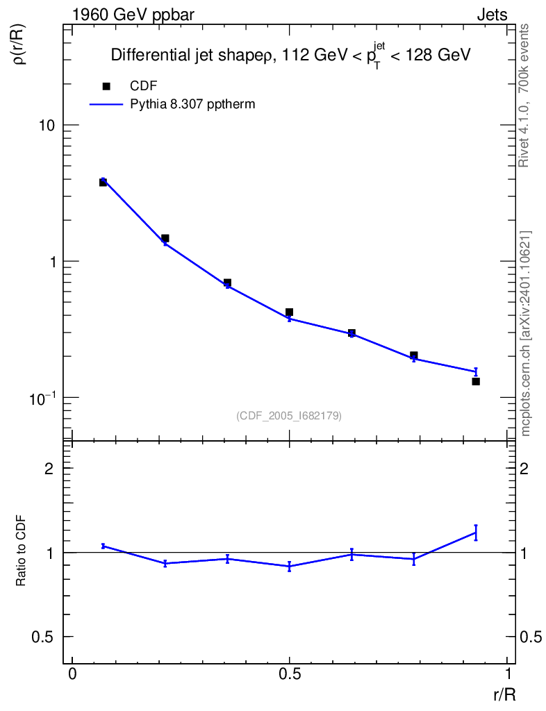 Lines: data, pythia8 8.307 pptherm |
