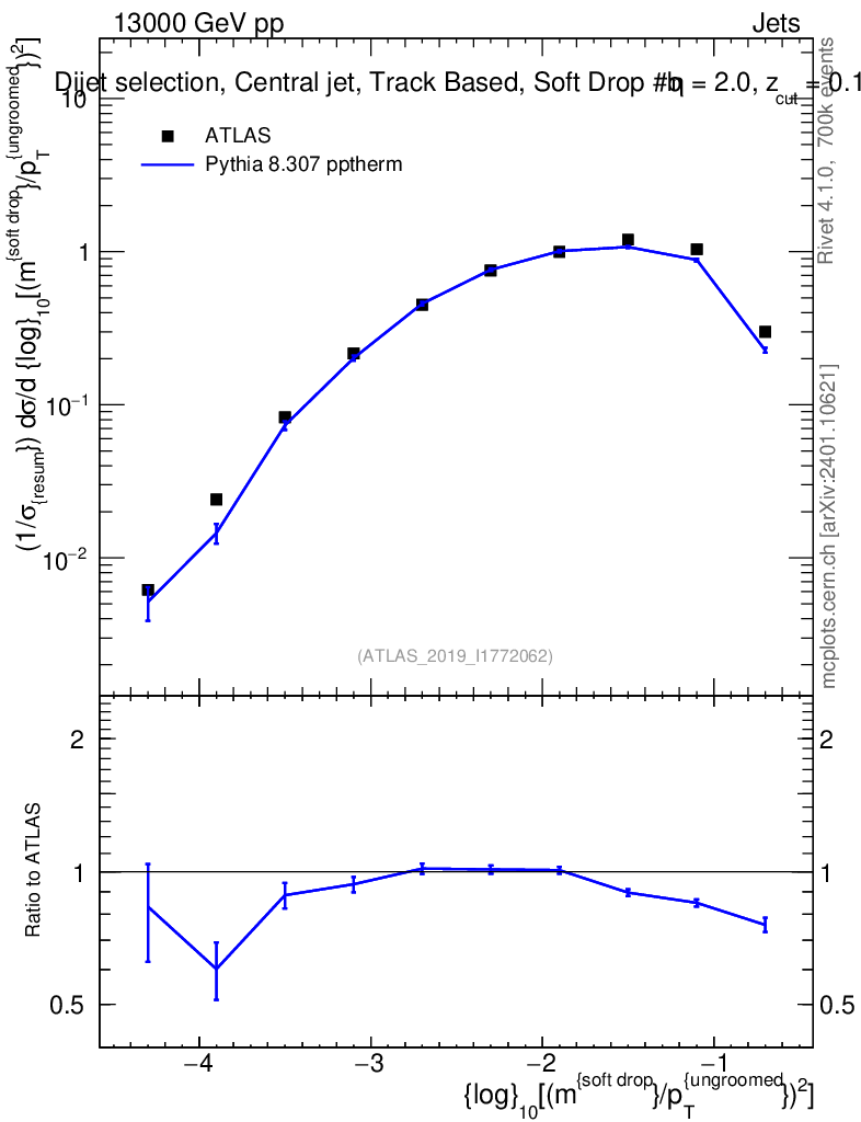 Lines: data, pythia8 8.307 pptherm |