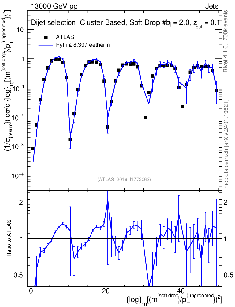 Lines: data, pythia8 8.307 eetherm |