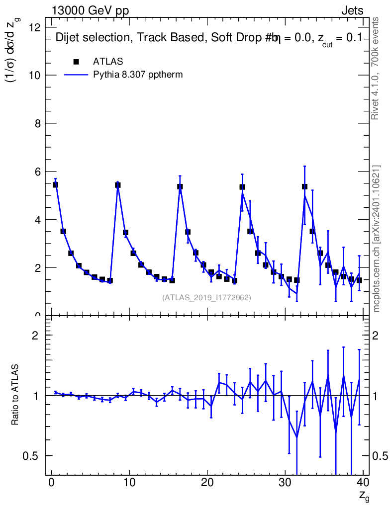 Lines: data, pythia8 8.307 pptherm |