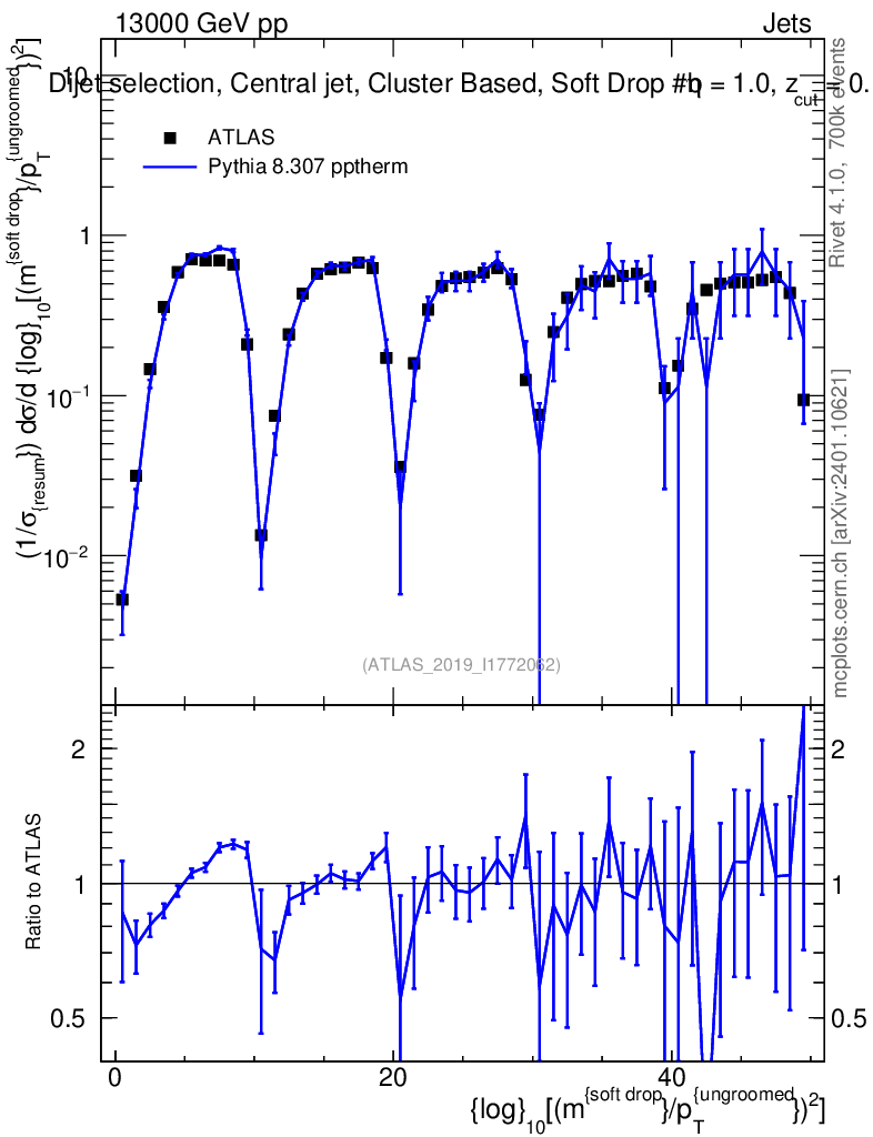 Lines: data, pythia8 8.307 pptherm |