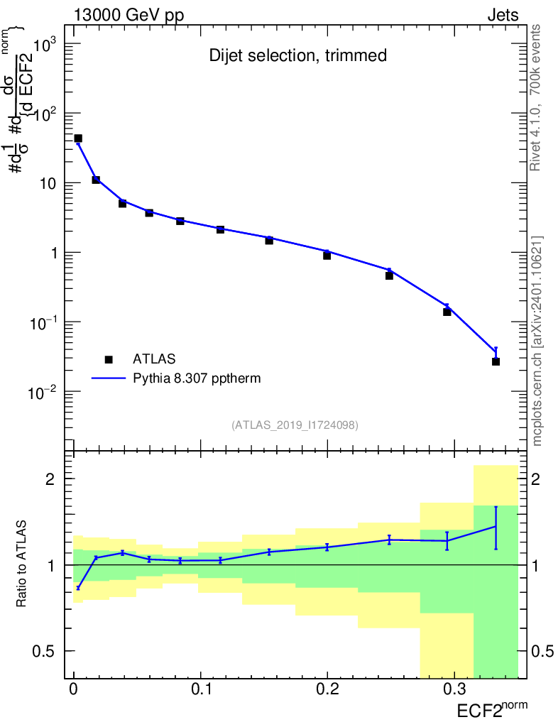 Lines: data, pythia8 8.307 pptherm |