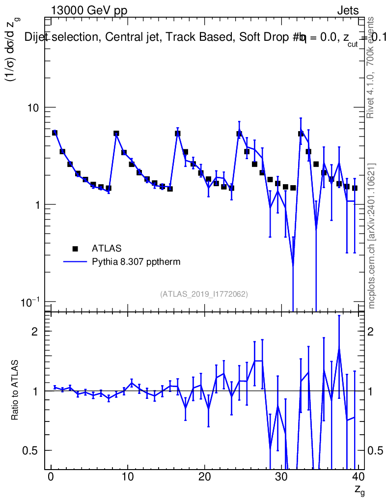 Lines: data, pythia8 8.307 pptherm |