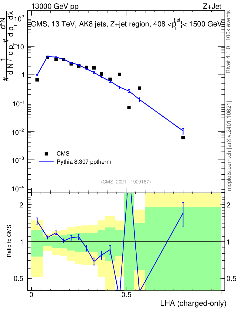Lines: data, pythia8 8.307 pptherm |