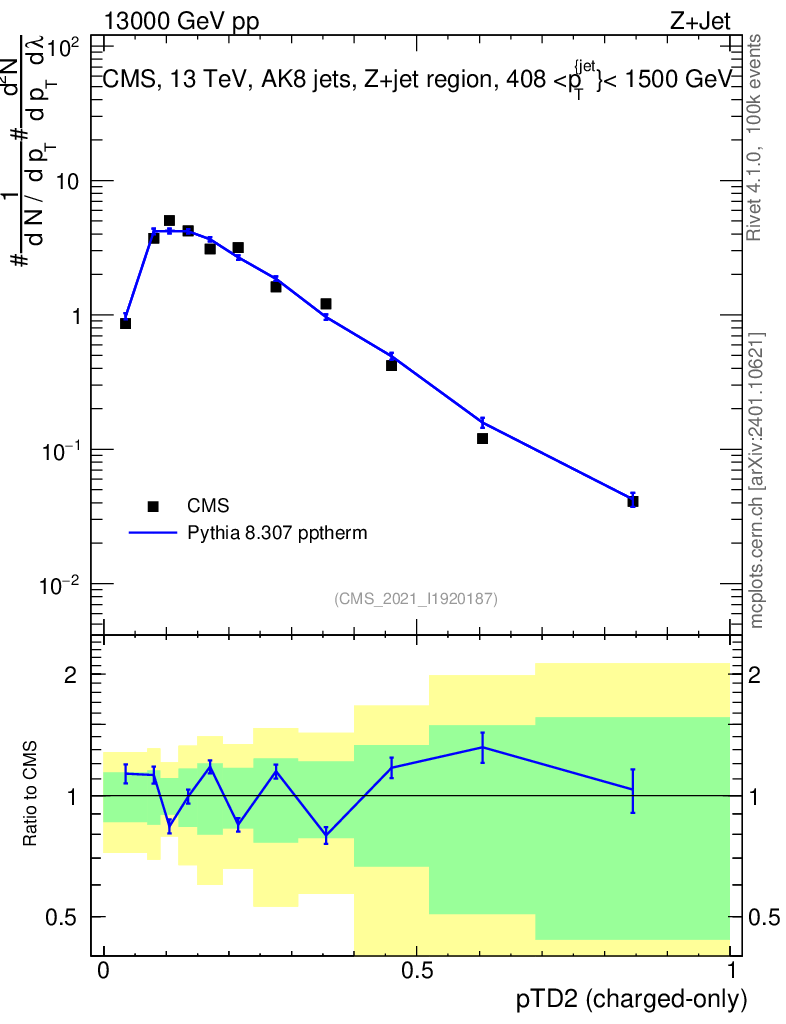 Lines: data, pythia8 8.307 pptherm |