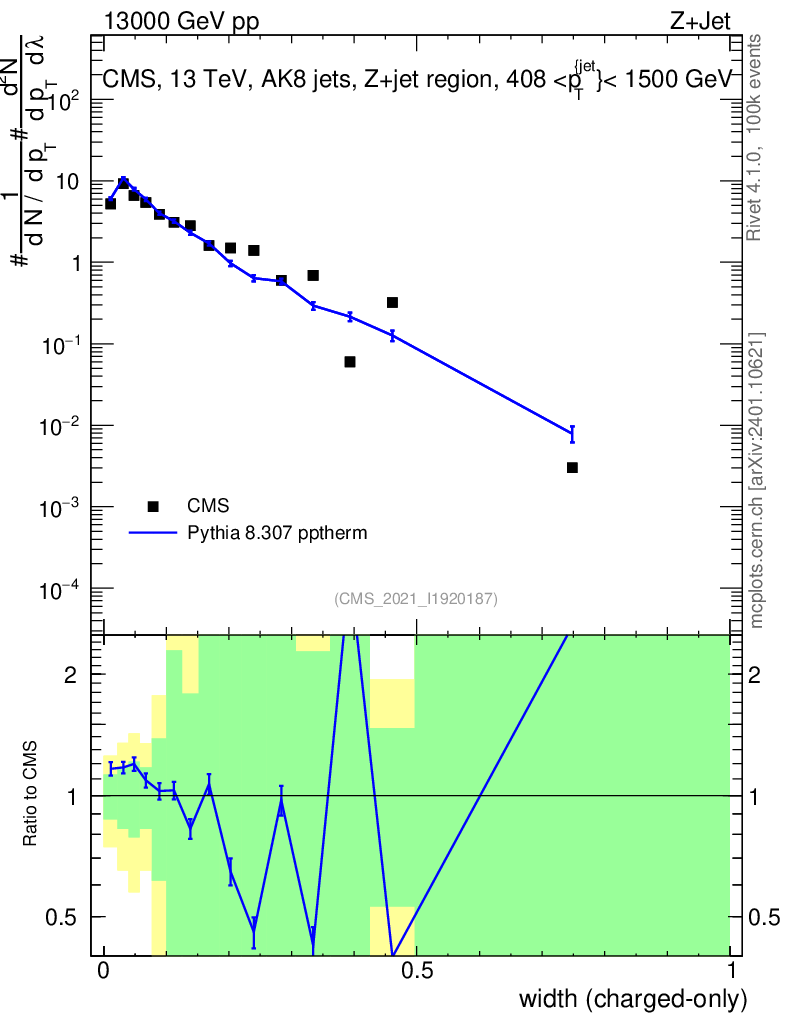 Lines: data, pythia8 8.307 pptherm |