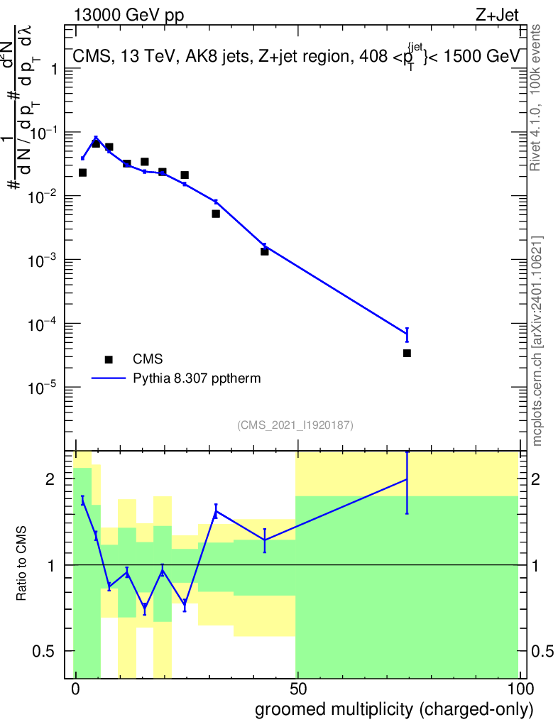 Lines: data, pythia8 8.307 pptherm |