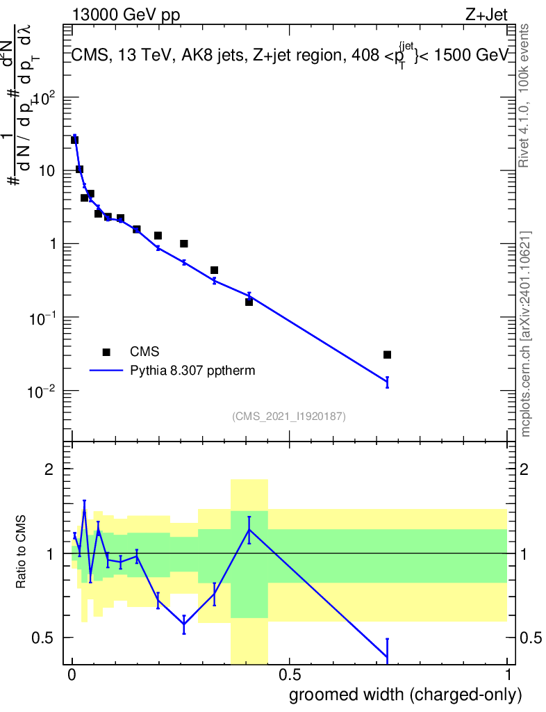 Lines: data, pythia8 8.307 pptherm |