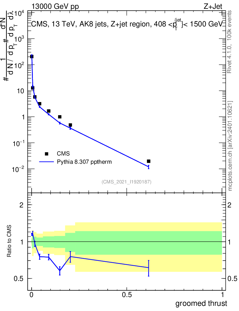 Lines: data, pythia8 8.307 pptherm |