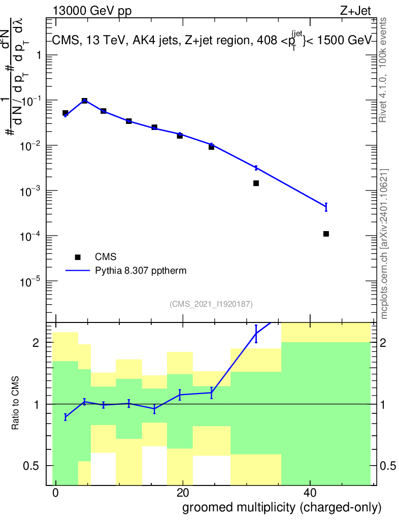 Lines: data, pythia8 8.307 pptherm |