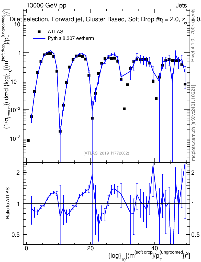 Lines: data, pythia8 8.307 eetherm |