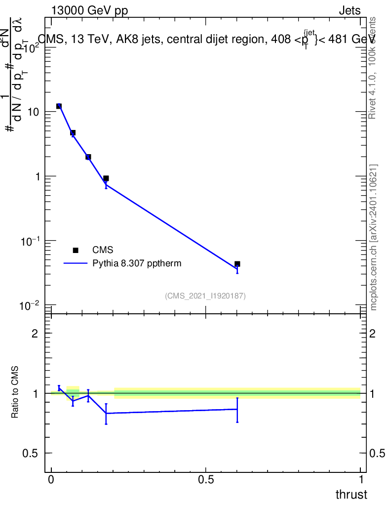 Lines: data, pythia8 8.307 pptherm |