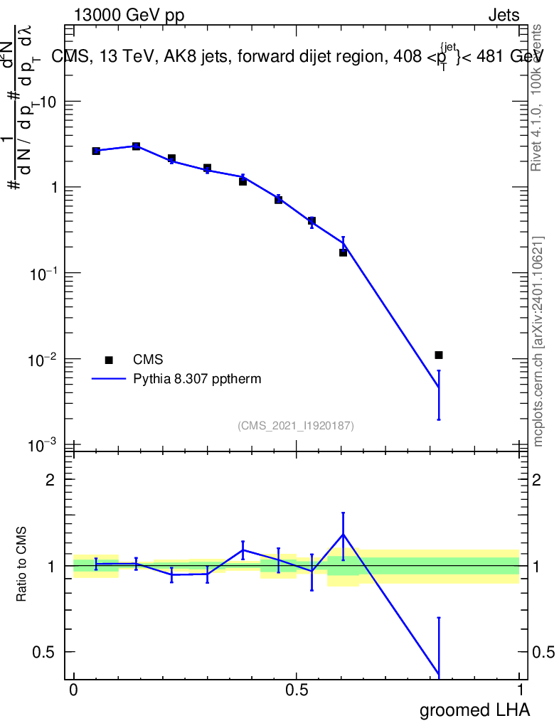 Lines: data, pythia8 8.307 pptherm |