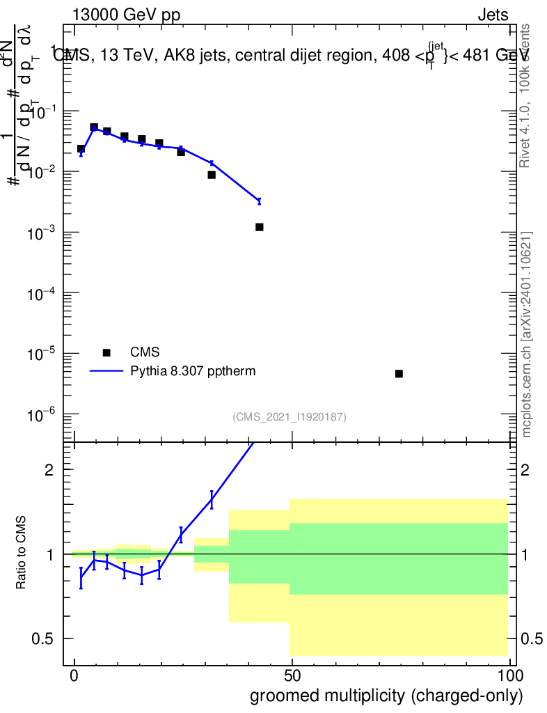 Lines: data, pythia8 8.307 pptherm |
