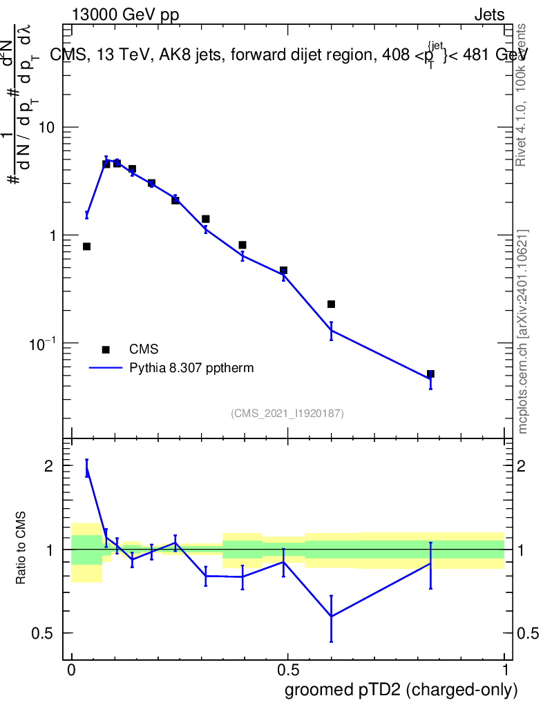 Lines: data, pythia8 8.307 pptherm |