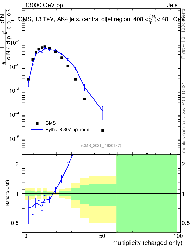 Lines: data, pythia8 8.307 pptherm |