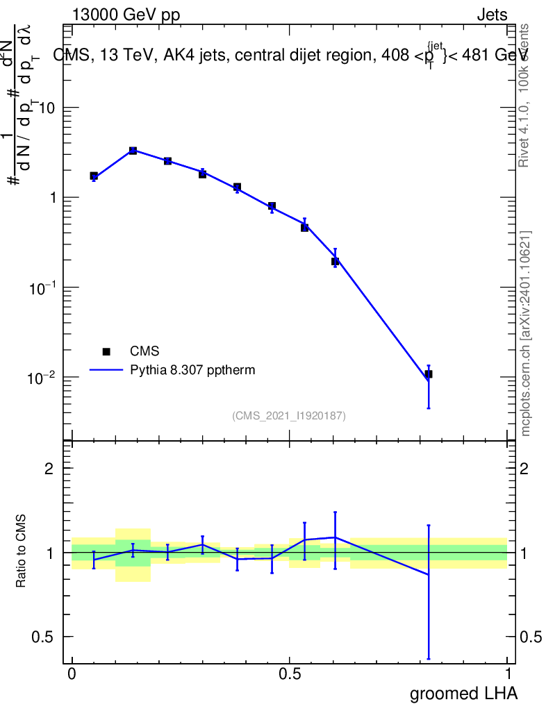 Lines: data, pythia8 8.307 pptherm |