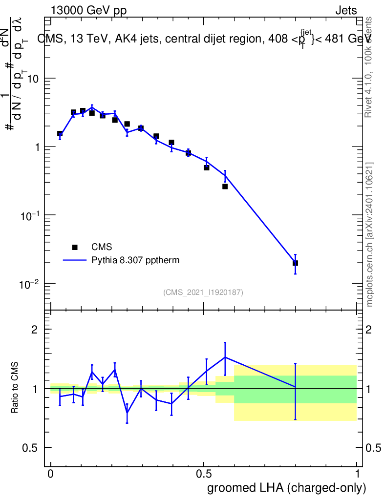 Lines: data, pythia8 8.307 pptherm |
