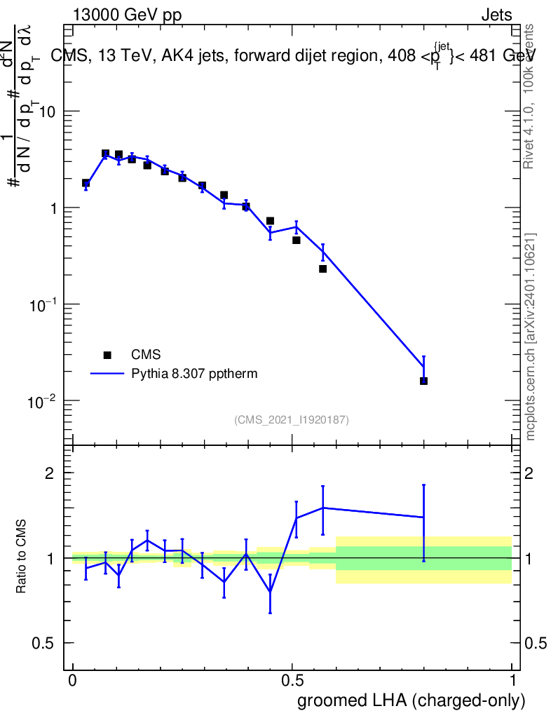 Lines: data, pythia8 8.307 pptherm |