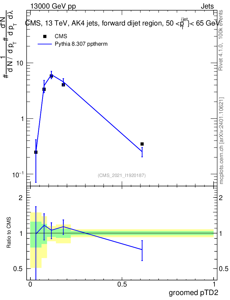 Lines: data, pythia8 8.307 pptherm |