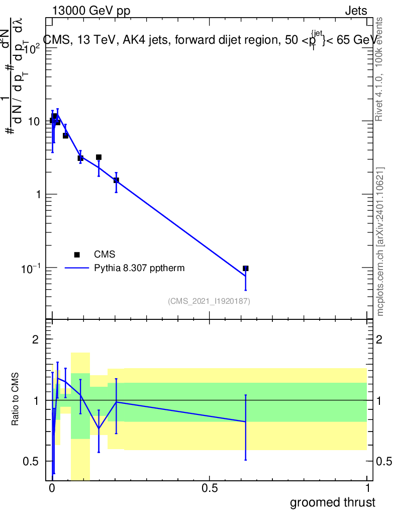 Lines: data, pythia8 8.307 pptherm |