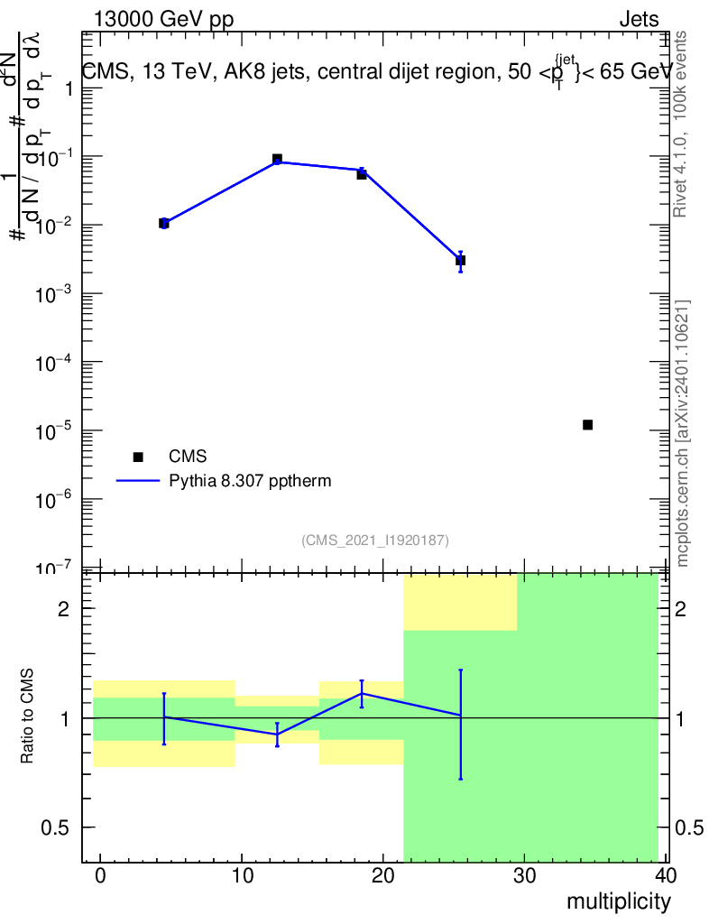 Lines: data, pythia8 8.307 pptherm |
