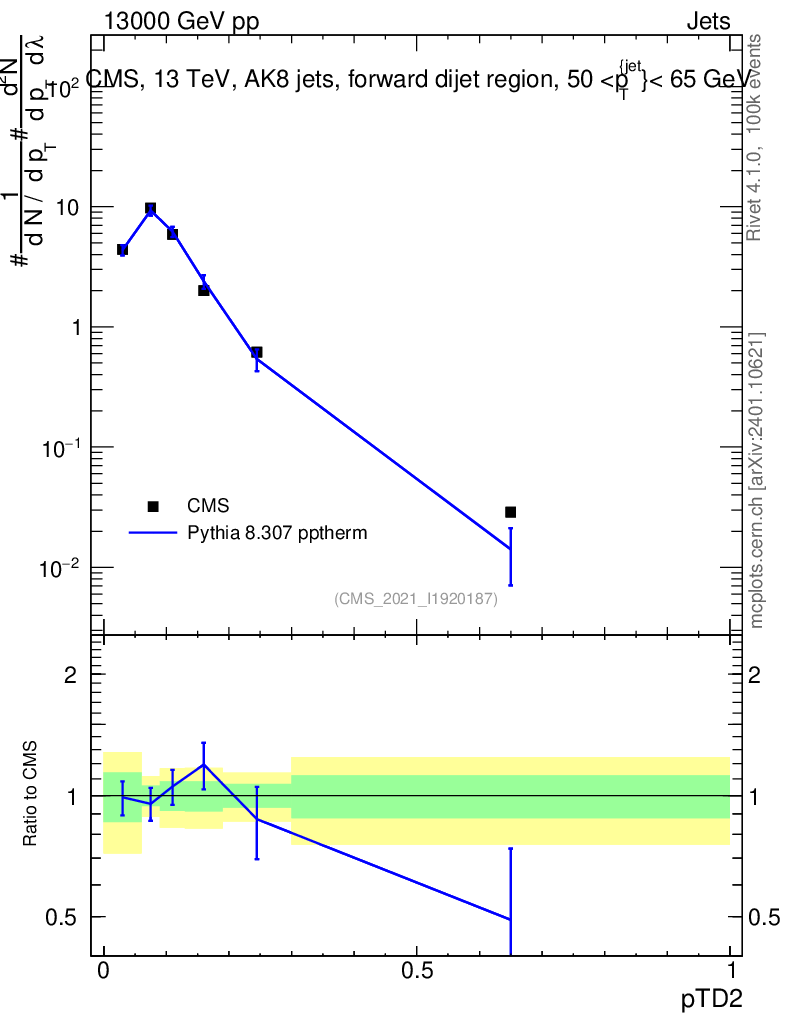 Lines: data, pythia8 8.307 pptherm |