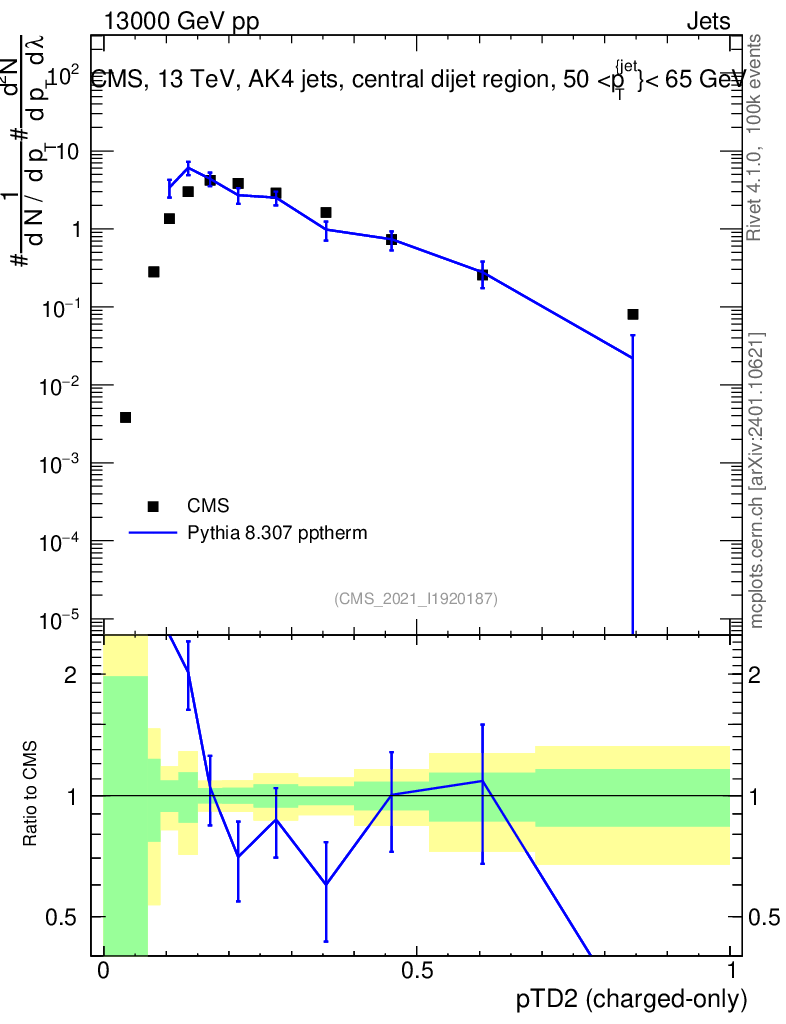 Lines: data, pythia8 8.307 pptherm |