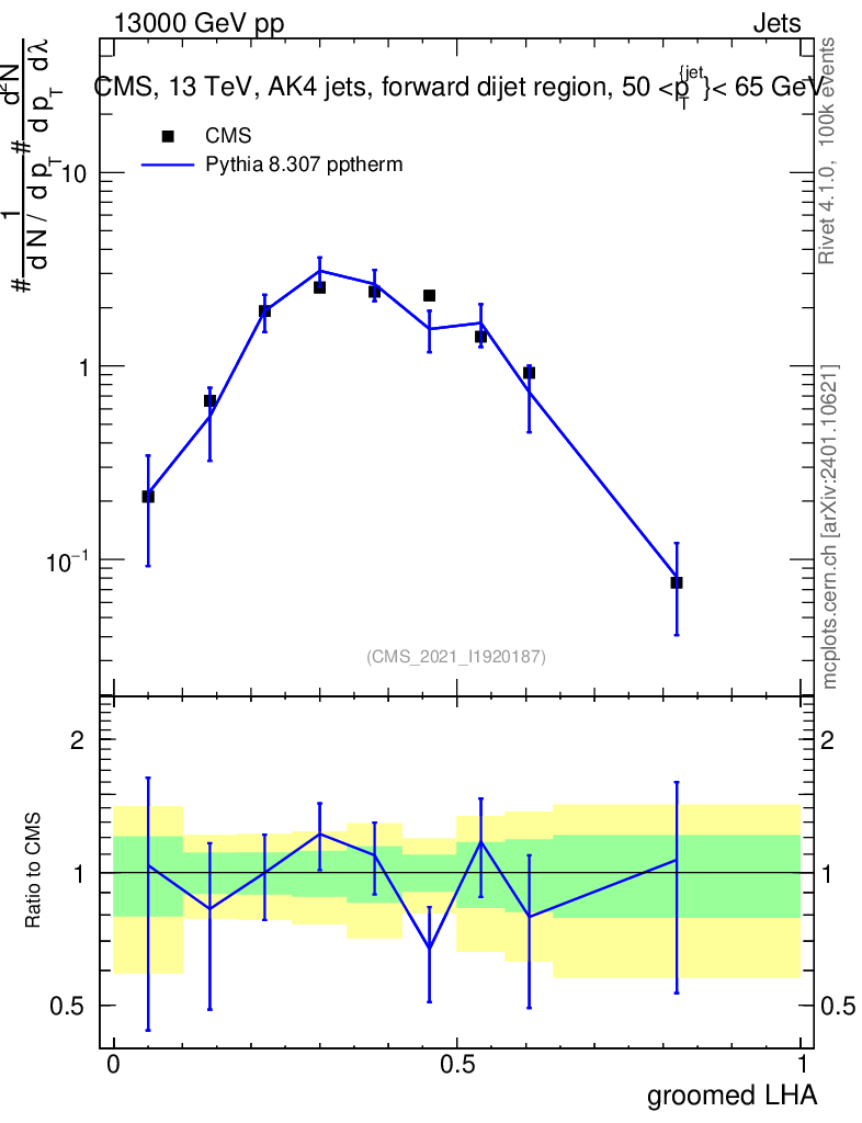 Lines: data, pythia8 8.307 pptherm |